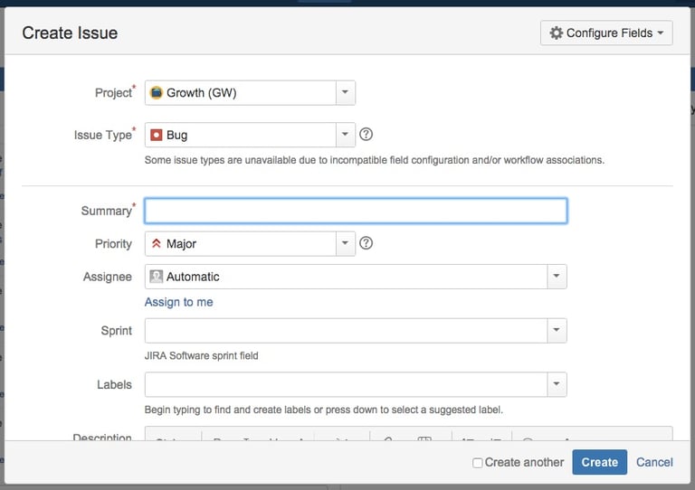 - First, we create a new story in JIRA, marking it as a ‘bug’.